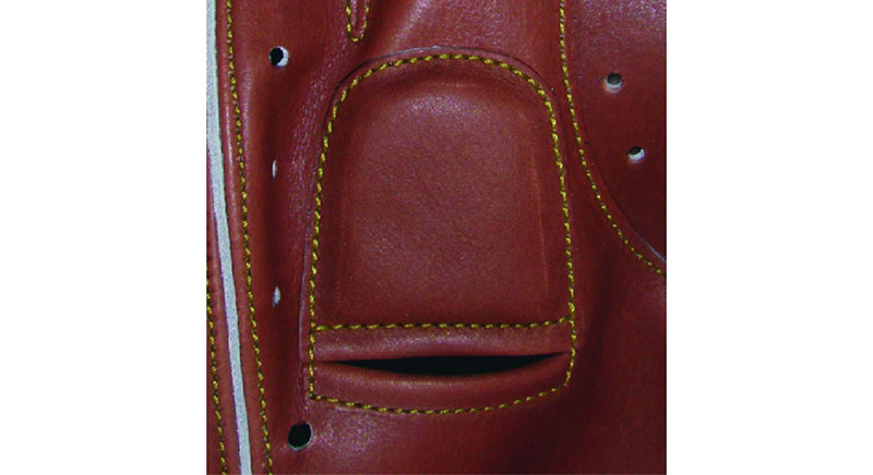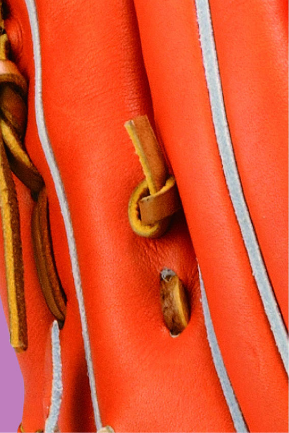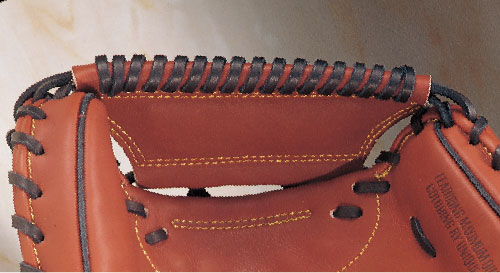 キャッチャーミットの親指、子指のパッド部分のミシン目を無くし、ハミダシで破れを防止しました。