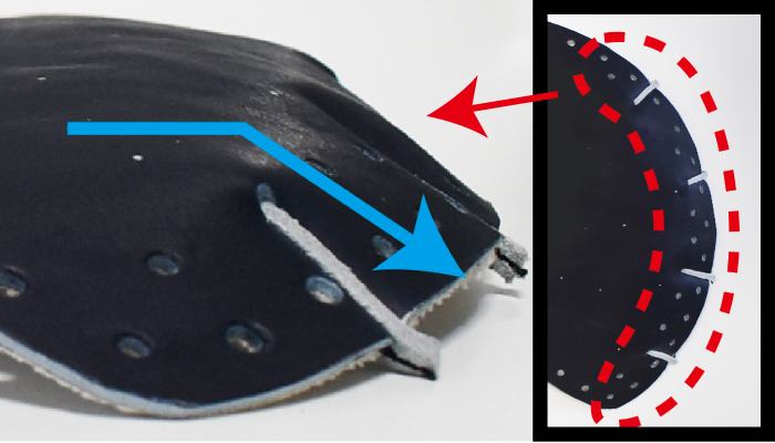 ヒラの指先部分にハミダシを挟み、角度を付けることで反りを防止し、耐久性をアップしました。