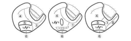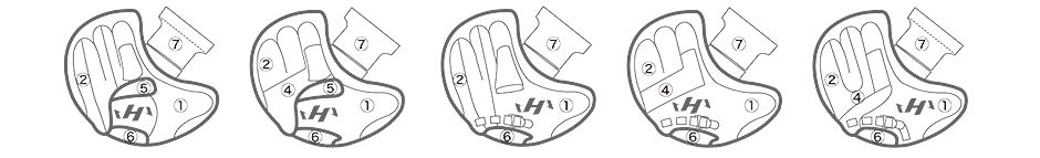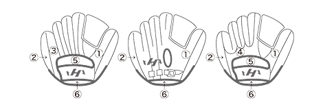 ①親指部 ②子指部(外側)③子指部(内側)④甲部 ⑤裏革(窓見部)⑥裏革(手口下部)⑦ウェブ ⑧親指部(外側)